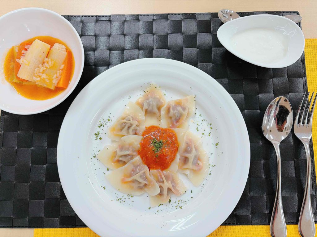 料理は「トルコ風水餃子」「長ねぎのオリーブオイル煮」。ミント味の牛ひき肉を包んだ水餃子をバターソースとヨーグルトソースで召し上がっていただきます。