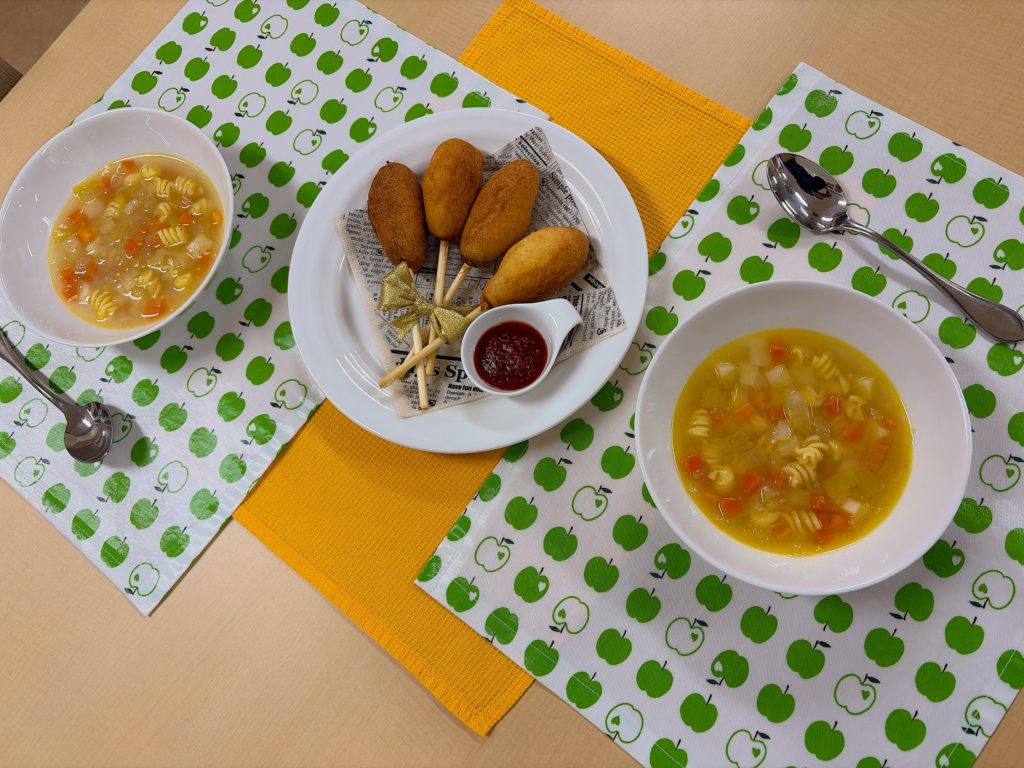 今回のメニューは「アメリカンドッグ」と「ミネストローネスープ」。
